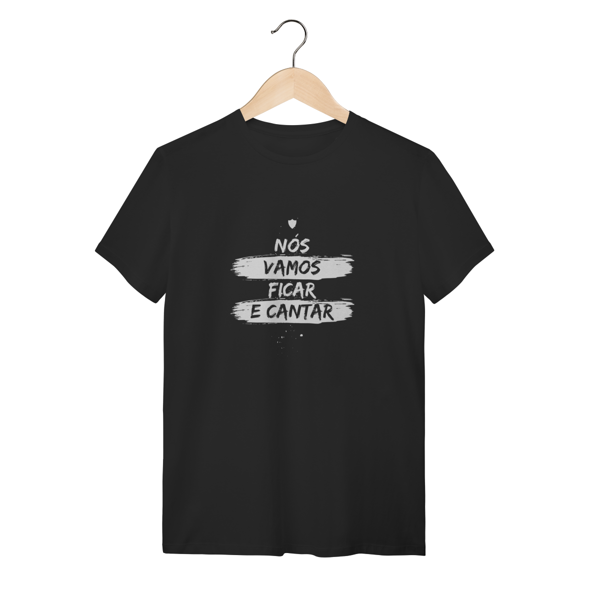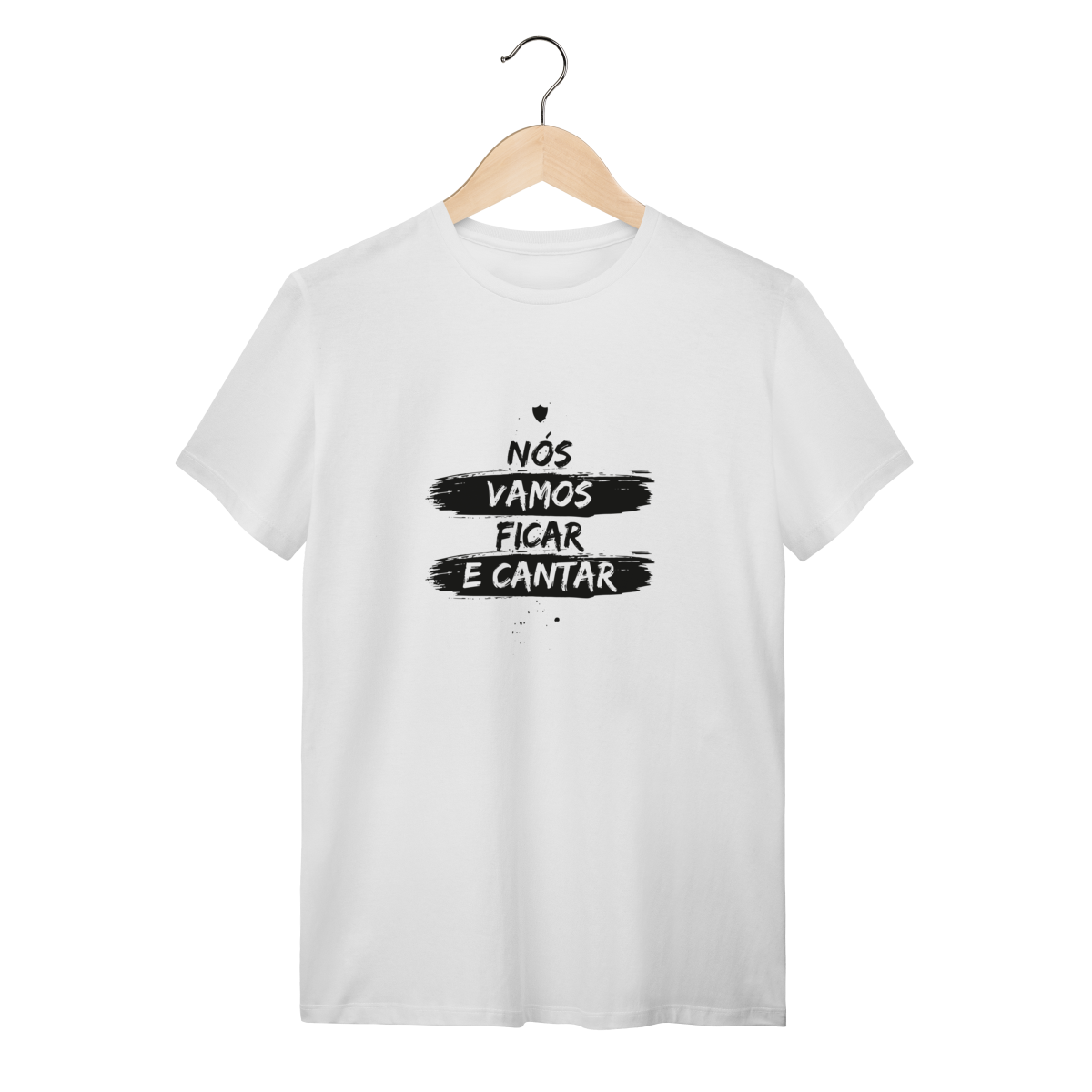 • Design: Frase "NÓS VAMOS FICAR E CANTAR" em tipografia estilo pintura de rua, com acabamento bruto e dinâmico. Estampa centralizada (peito).